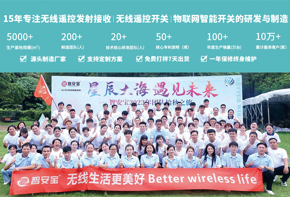 深圳市智安寶電子有限公司成立于2009年,品牌簡(jiǎn)稱(chēng)“智安寶”,總部位于中國(guó)深圳,是一家專(zhuān)注于射頻無(wú)線(xiàn)遙控器、無(wú)線(xiàn)收發(fā)模組、無(wú)線(xiàn)智能控制器、工業(yè)物聯(lián)網(wǎng)控制系統(tǒng)、智能家居配件等產(chǎn)品的研發(fā)、生產(chǎn)和銷(xiāo)售于一體的國(guó)家科技型技術(shù)企業(yè), 公司發(fā)展至今,始終秉承創(chuàng)業(yè)初心,致力于為時(shí)代創(chuàng)造一個(gè)安全、便捷、智能的品質(zhì)生活空間而不懈奮斗。