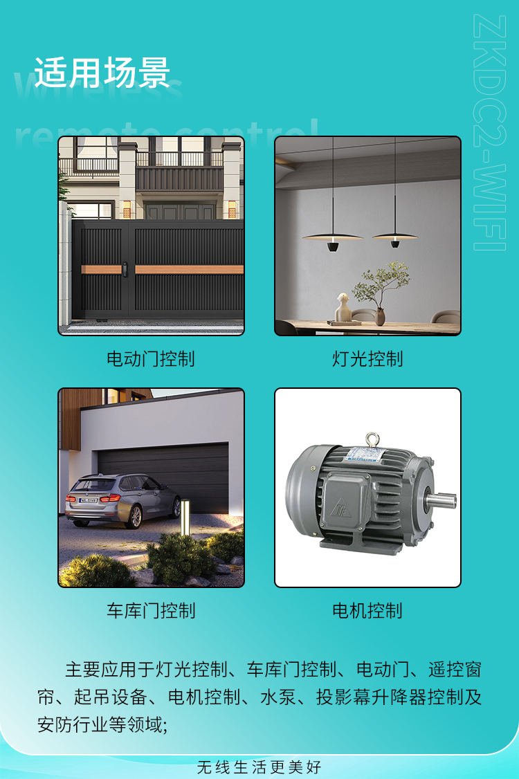 主要應(yīng)用于燈光控制、車庫(kù)門控制、電動(dòng)門、遙控窗簾、起吊設(shè)備、電機(jī)控制、水泵、投影幕升降器控制及安防行業(yè)等領(lǐng)域。