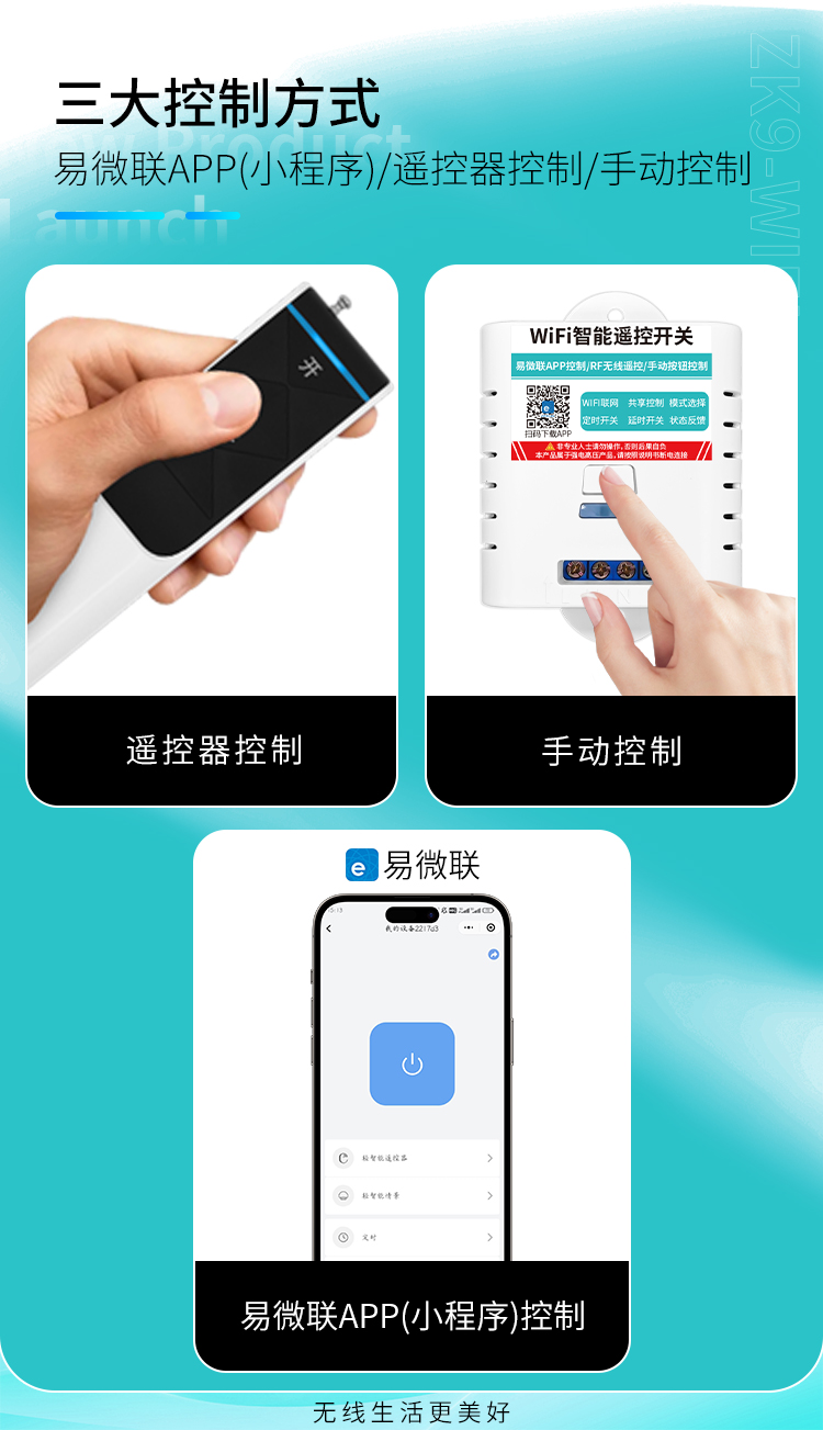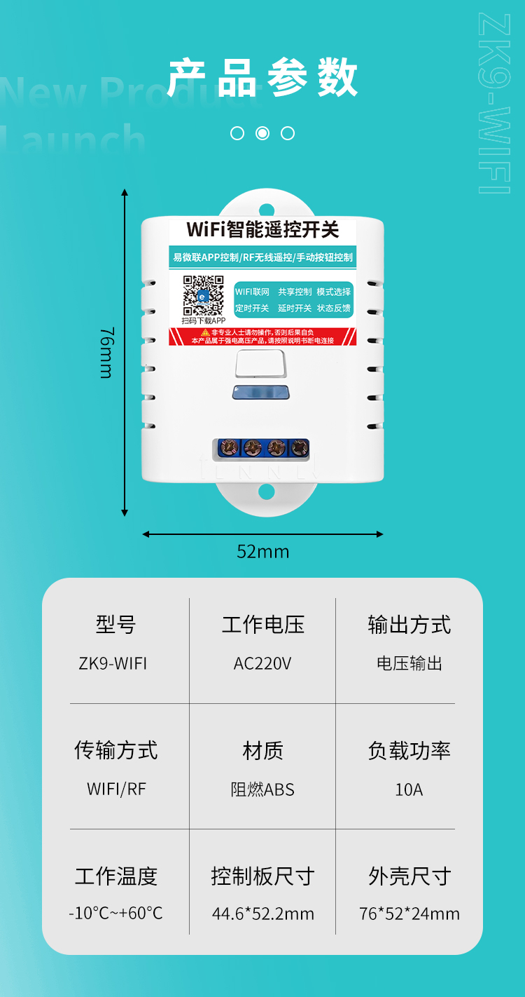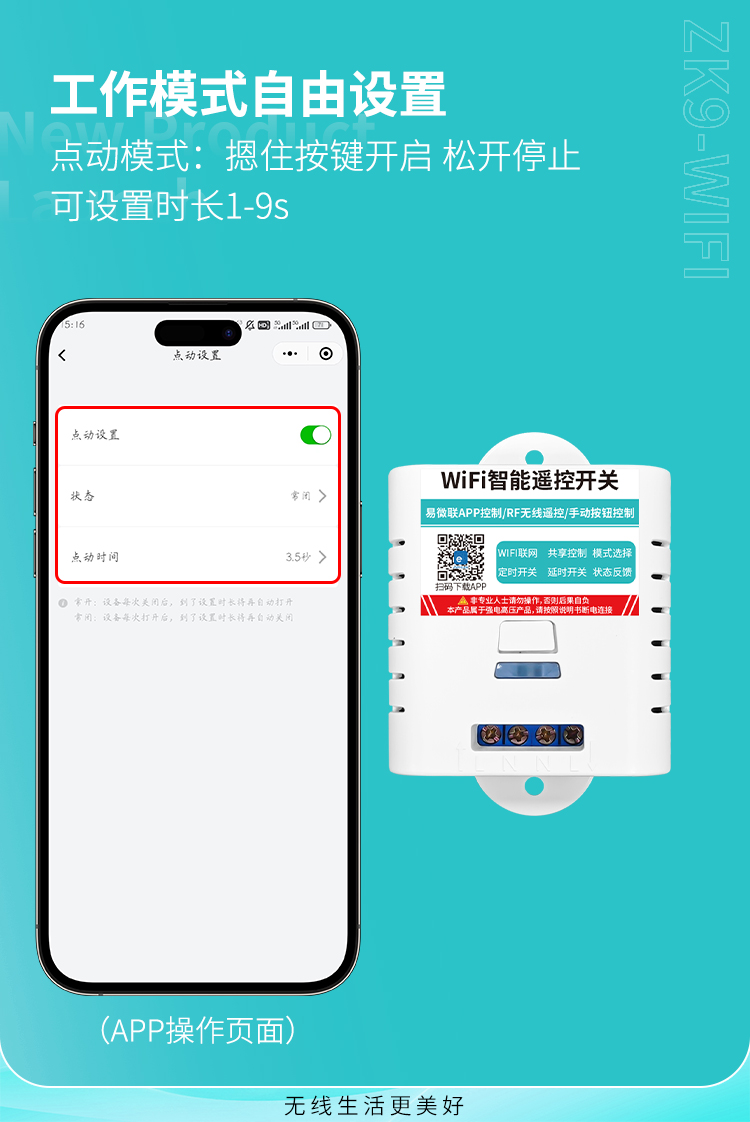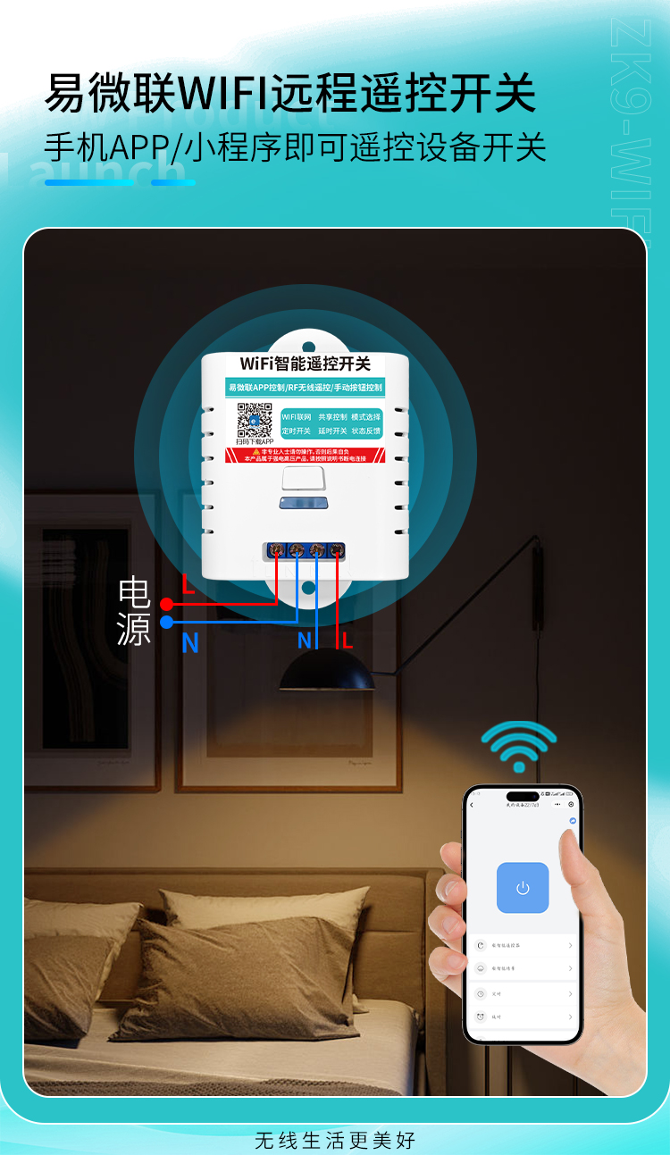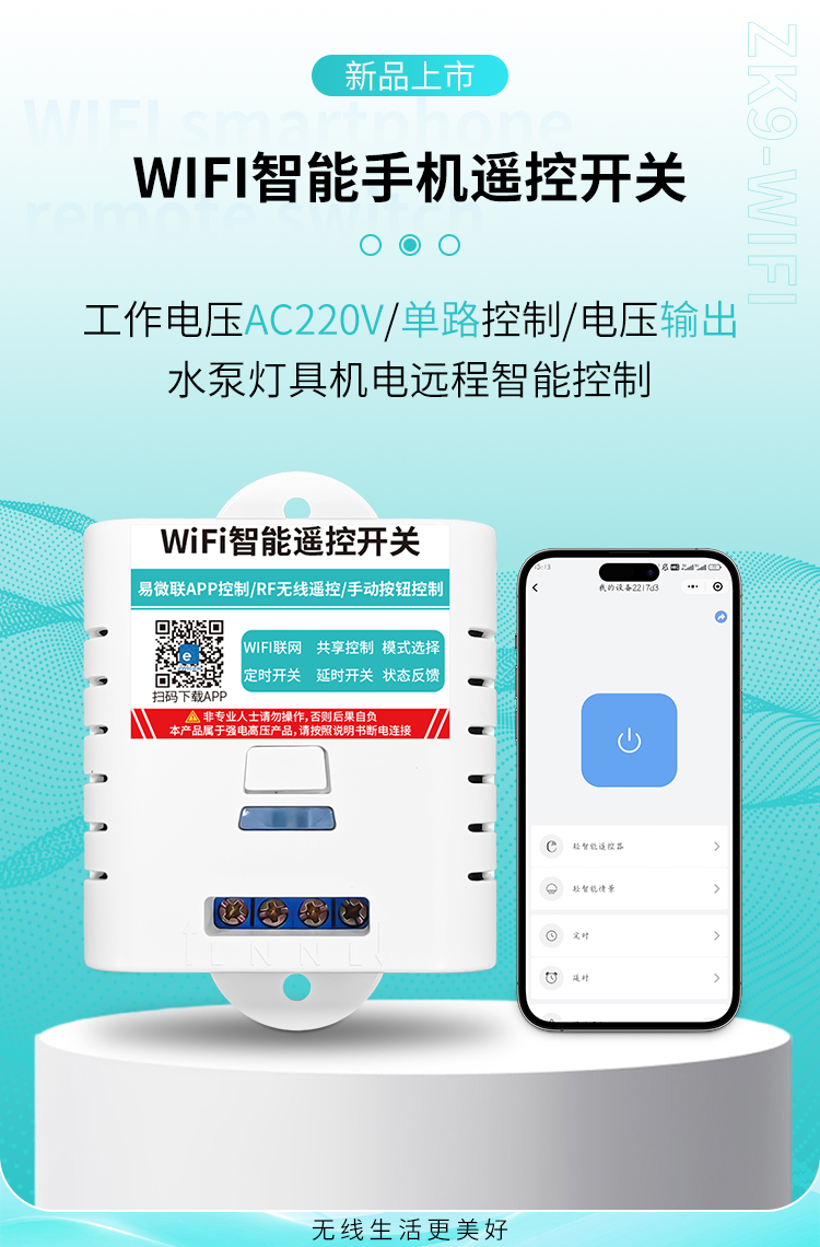ZK9-WIFI是一款單路智能遙控開關(guān),可使用手機遙控,電壓輸出