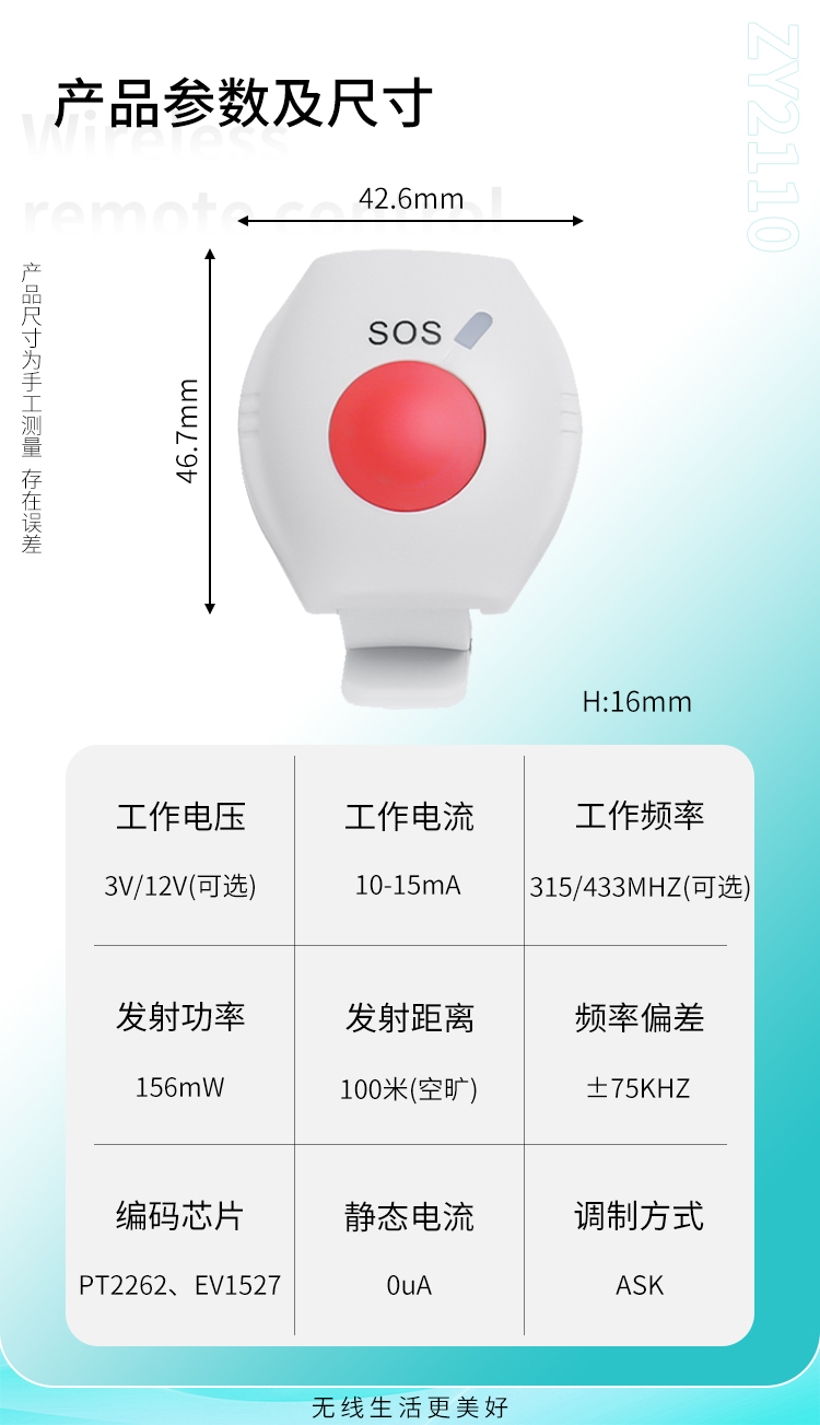1、腕表式設(shè)計,攜帶和使用方便;2、按鍵延時觸發(fā),避免誤報;3、功耗低,電池使用時間長。