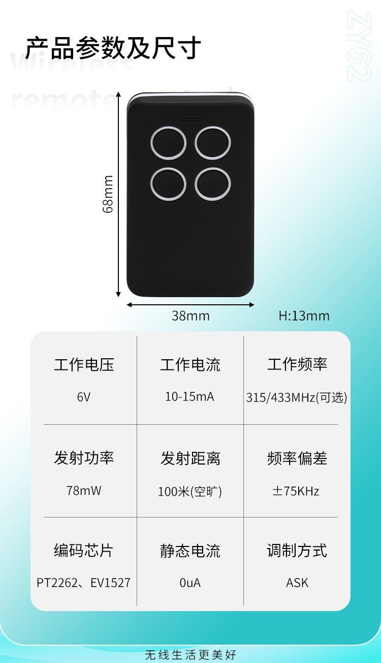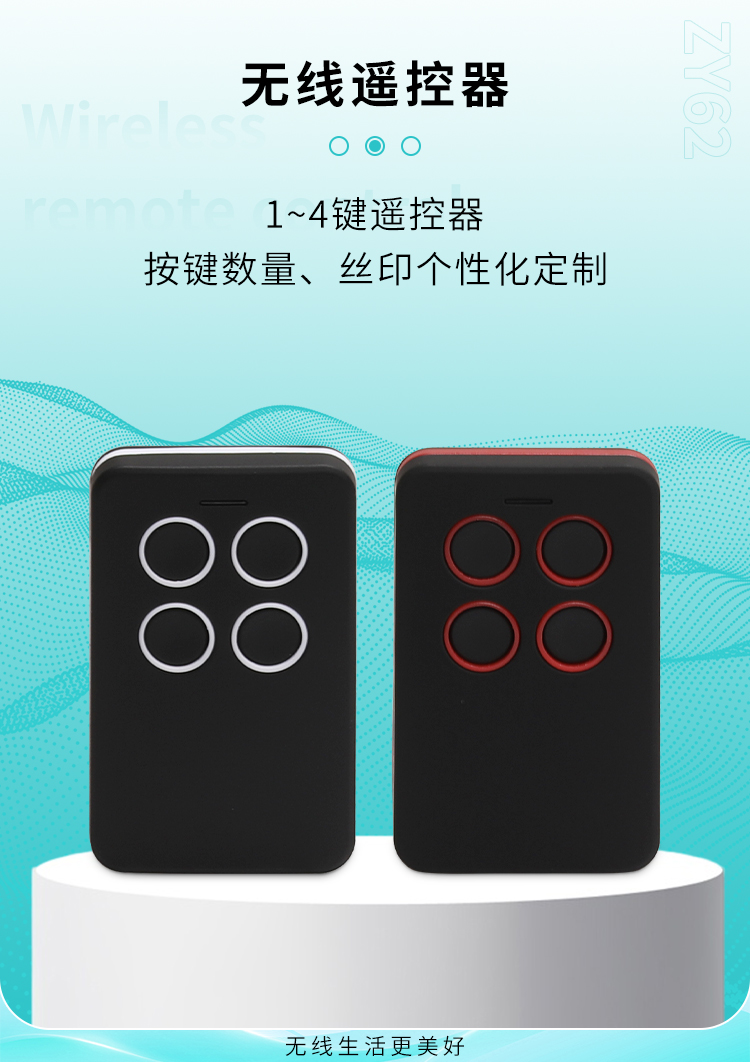ZY62-4是一款具有4個(gè)觸發(fā)按鍵的無線遙控器,可以跟本公司的接收模塊或控制器配套使用;也可以單獨(dú)為客戶應(yīng)用,一般應(yīng)用于無線電設(shè)備的遙控;如節(jié)能燈光、家庭防盜系統(tǒng)、工業(yè)或家庭遙控控制等。ZY62-4無線遙控器,具有可靠性高、頻率穩(wěn)定、穿透能力強(qiáng)等特點(diǎn);其內(nèi)部電路設(shè)計(jì)采用聲表面諧振器穩(wěn)頻,全部采用SMD工藝,頻率315MHZ或433MHZ可選,編碼芯片采用EV1527,供電電源采用內(nèi)置CR2016兩節(jié)共6V電池供電。