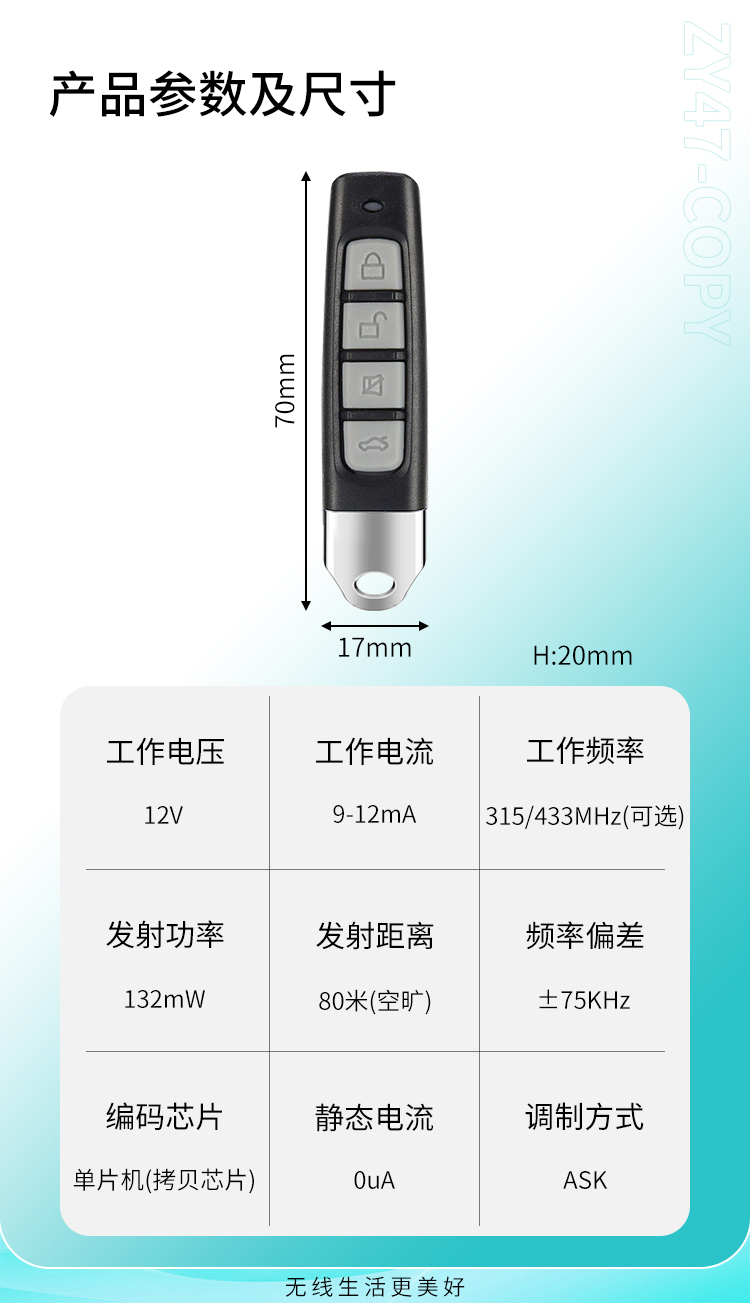ZY47-COPY是一款小功率拷貝無(wú)線遙控器,體積小、精致、美觀